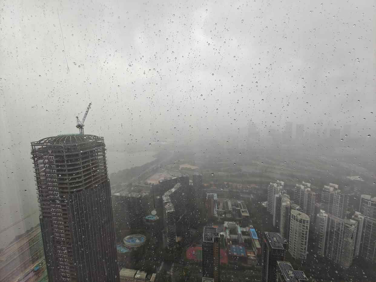 丁先生住在72楼,24日上午,他看到海面上有一些泛起的波浪,灰色云雾夹杂着风雨逐渐逼近。10点钟雨雾加大,对面春笋和人才公园只能模糊看见。