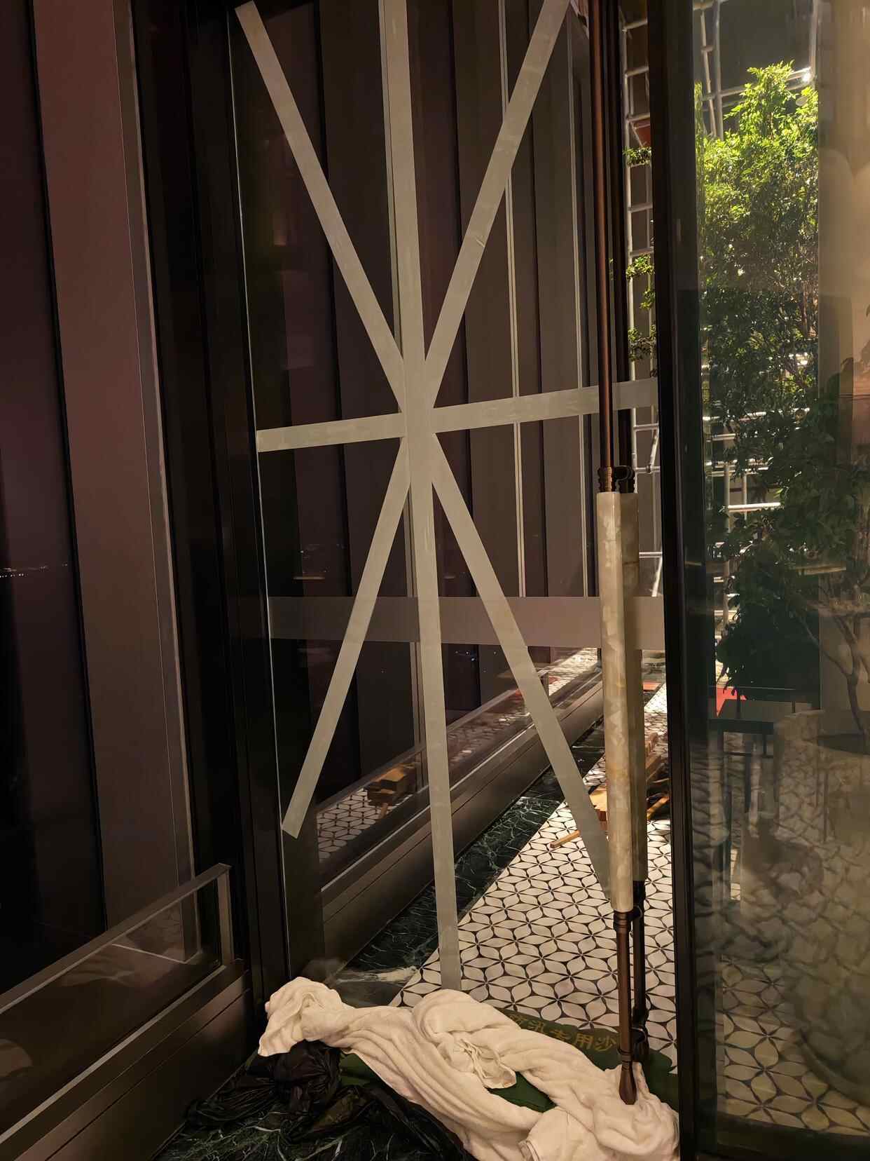 “23日晚上10点多,我曾到66层,听到很明显的风声呼啸。观景的区域被关闭,放了沙袋,玻璃上贴了'米'字形胶布。在通风窗的缝隙处,能感到有风一阵一阵,风大时玻璃门会发生轻微晃动。”丁先生说。