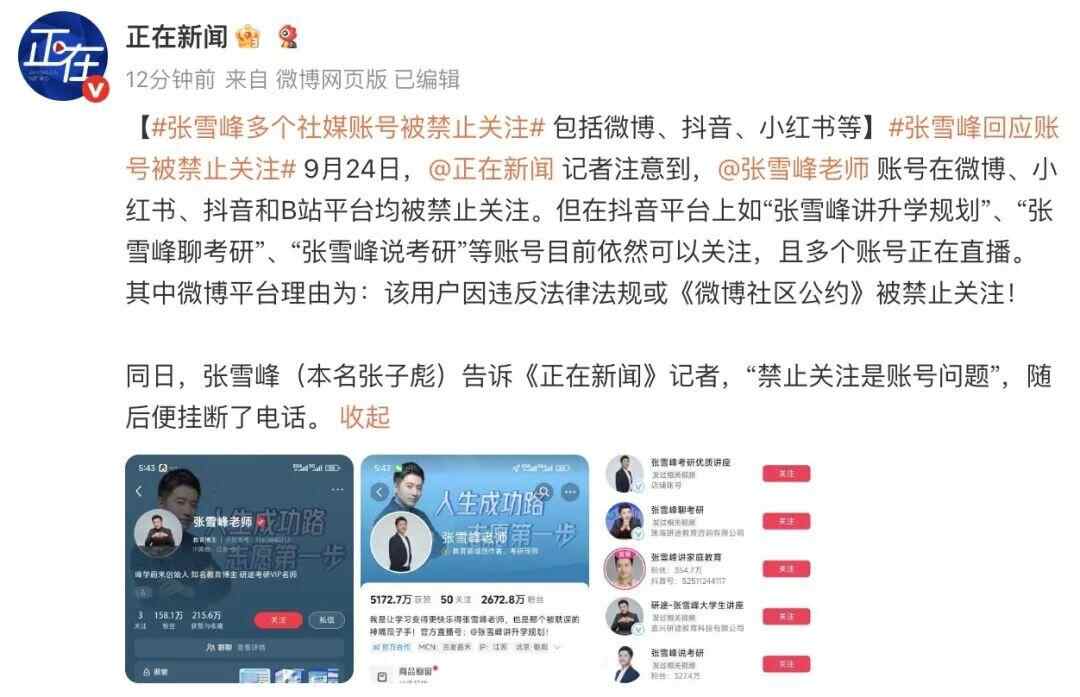 9月24日下午,记者发现张雪峰抖音、快手、微博、小红书、B站等多平台账号被禁止关注。其中微博平台理由为:该用户因违反法律法规或《微博社区公约》被禁止关注!