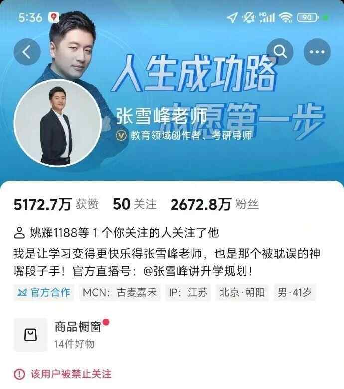 同日,据正在新闻报道,张雪峰告诉记者,“禁止关注是账号问题”,随后便挂断了电话。