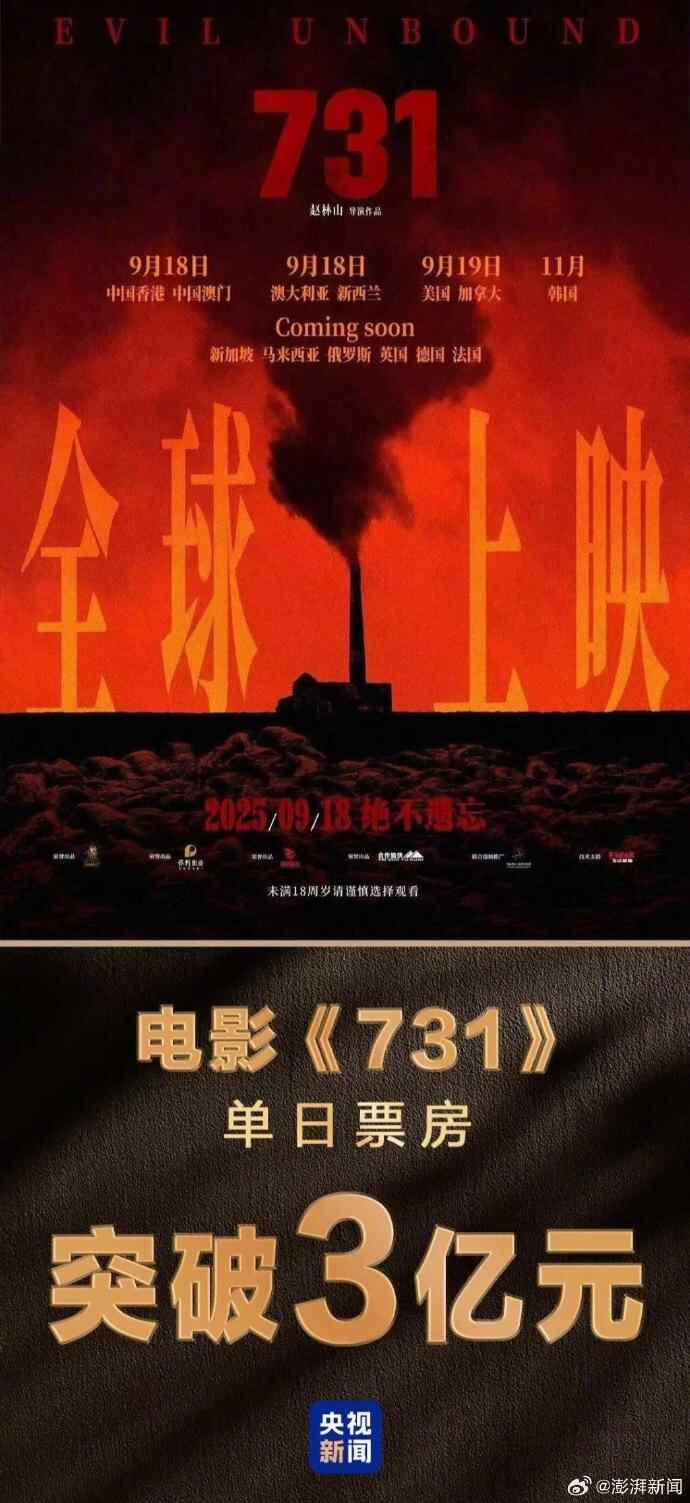 《731》自预售以来,淘票票、猫眼两大票务网站上超700万的人点击了“想看”,影片上映当日,也打破了中国首映日场次纪录(原纪录保持者《速度与激情9》22.9万场)、国产片首映日场次纪录(原纪录保持者《独行月球》22.3万场)以及过去三年首映日场次纪录(原纪录保持者《独行月球》22.3万场)等3项影史纪录,274149场放映吸引了近千万人次的观众走进影院,回望历史。