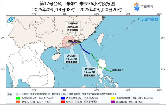 昨天(9月18日)下午,南海热带低压发展成为今年第17号台风“米娜”,它将携明显风雨影响华南。据@广东天气,19日08时,台风“米娜”中心位于北纬22点3度,东经115点8度,也就是位于距离汕尾市偏南方向约70公里的海面上,中心附近最大风力9级,达到23米每秒的风速,中心最低气压990百帕,六级大风范围半径约460公里。