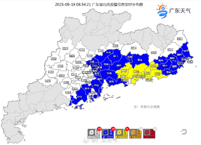 据@广东天气,截至19日08时54分,广东有68个市县台风预警信号生效中(29个白色、30个蓝色、9个黄色),19个市县暴雨预警信号生效中(9个黄色、10个橙色),12个市县雷雨大风预警生效中(10个黄色、2个橙色)。