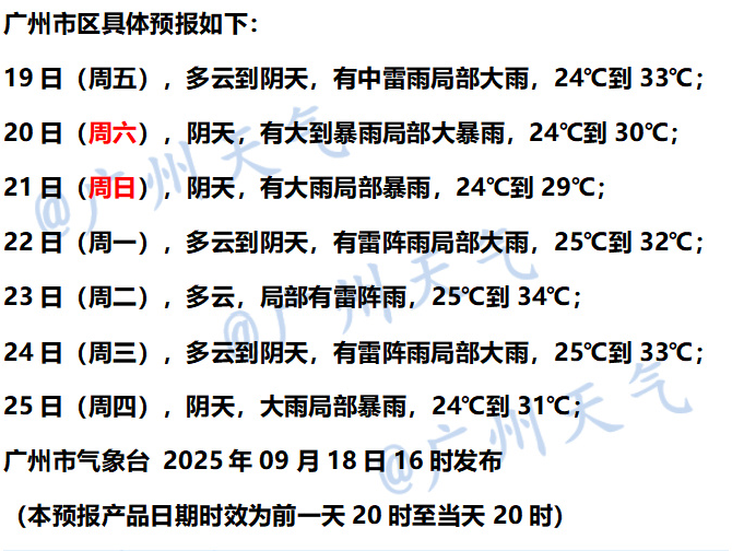 19日,粤东市县、河源和惠州阴天有暴雨到大暴雨局部特大暴雨,梅州、广州、东莞、深圳有大雨到暴雨局部大暴雨,其余市县多云,有(雷)阵雨局部暴雨,雷雨时阵风8~11级。最高气温:河源、梅州、惠州和粤东市县28℃~32℃,其余市县33℃~36℃。