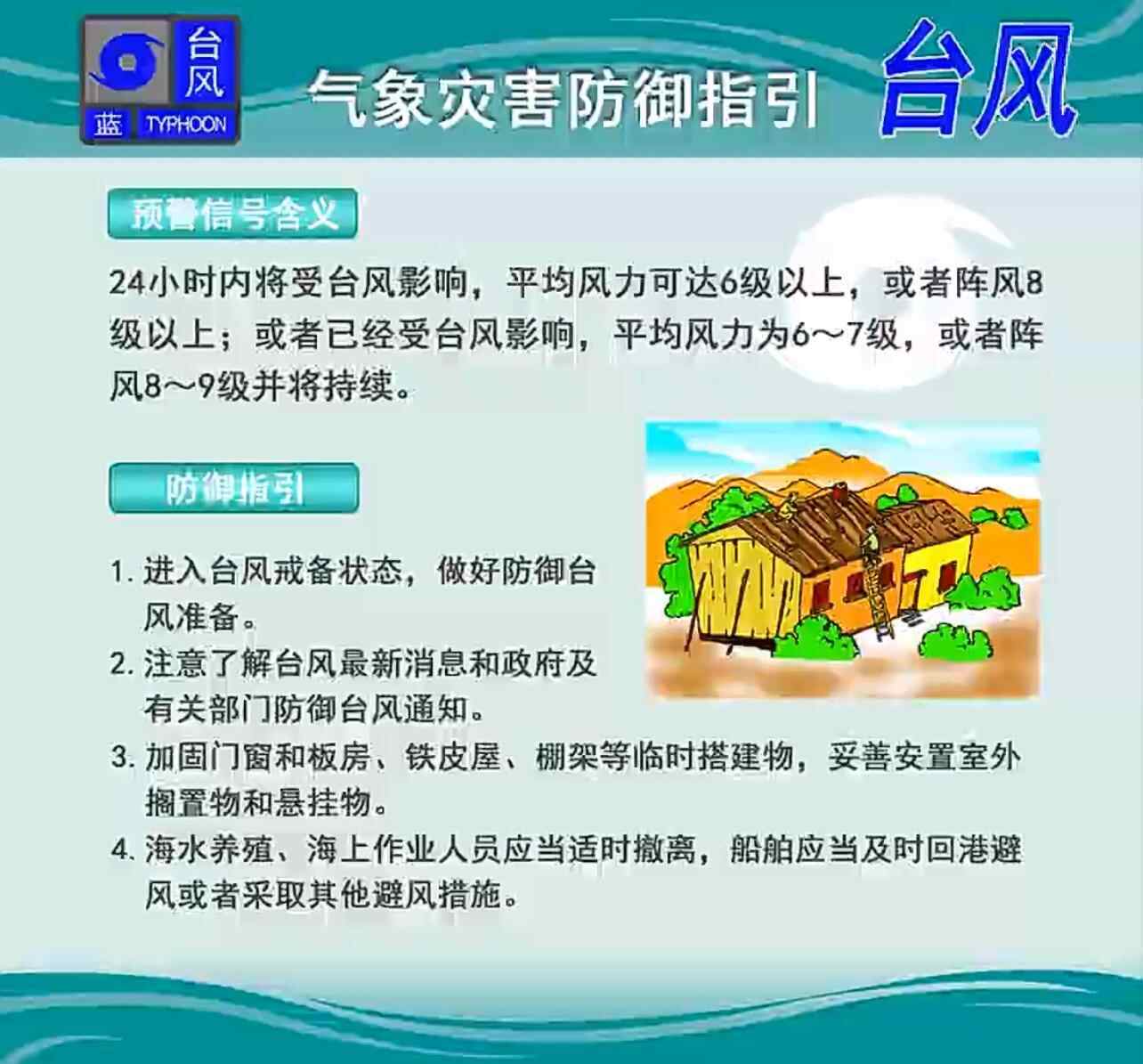 根据台风蓝色预警信号防御指引,该信号发布,意味着当地24小时内将受台风影响,平均风力可达6级以上,或者阵风8级以上;或者已经受台风影响,平均风力为6~7级,或者阵风8~9级并将持续。当地已进入台风戒备状态,做好防御台风准备;注意了解台风最新消息和政府及有关部门防御台风通知;加固门窗和板房、铁皮屋、棚架等临时搭建物,妥善安置室外搁置物和悬挂物;海水养殖、海上作业人员应当适时撤离,船舶应当及时回港避风或者采取其他避风措施。