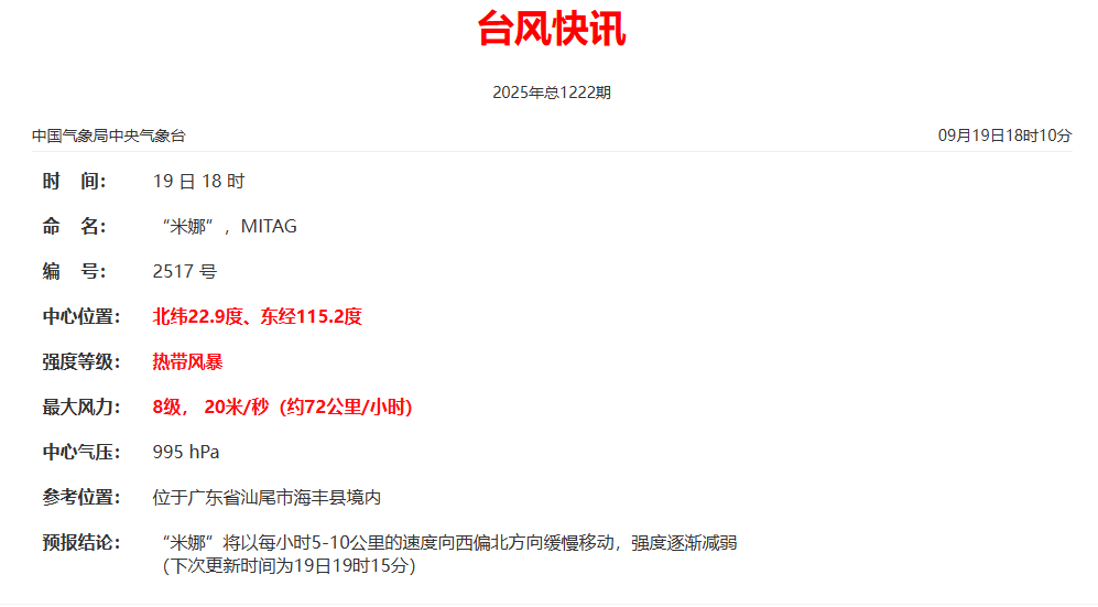 台风“米娜”已于9月19日14时50分前后在汕尾城区沿海登陆。受其带来的降雨影响,预计9月19日至21日,广东省部分河流将出现1~5米左右的涨水过程,部分水文站点可能达到或超过警戒水位。