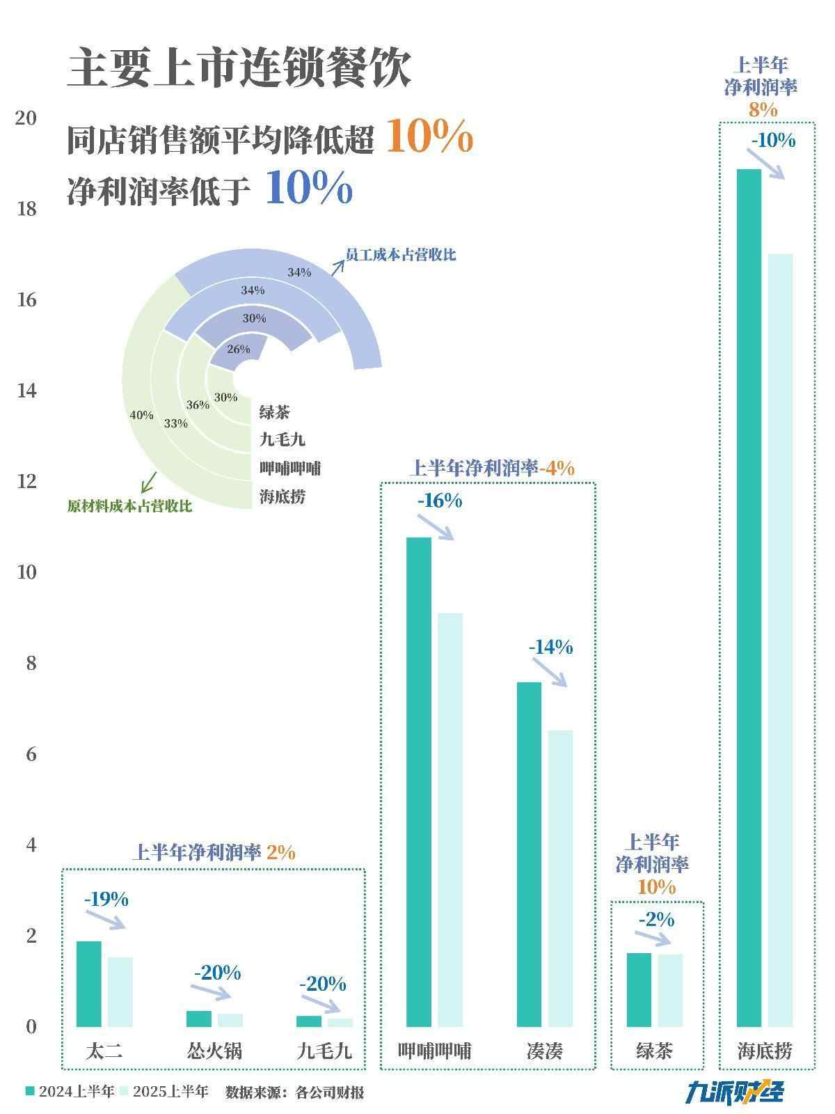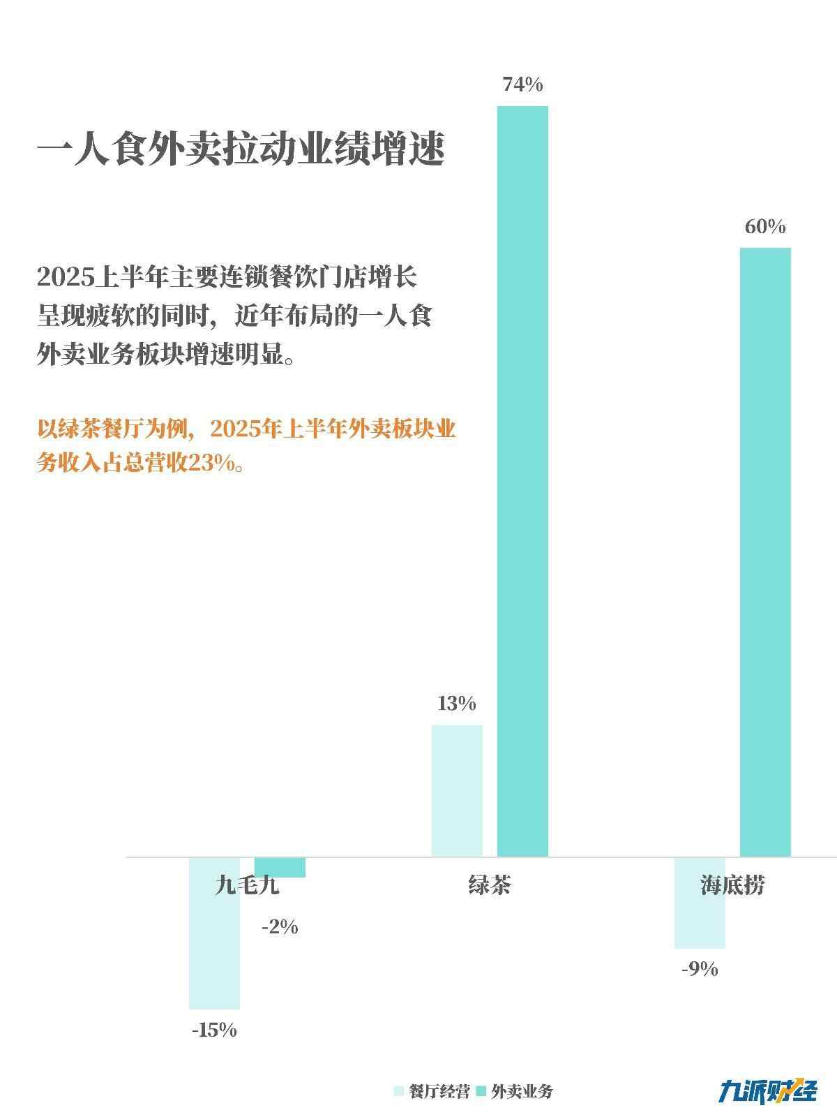 以中高端大餐定位的连锁餐厅,上半年却主要依赖一人食外卖业务拉动业绩增速。2025年上半年,太二、海底捞、怂火锅、九毛九等连锁餐饮同店销售额出现明显下滑,绿茶和海底捞两家的外卖业务板块收入却分别同比增长74%和60%,增速远高于餐厅经营板块的13%和-9%。