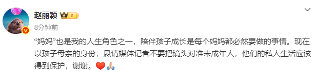 9月19日,赵丽颖发文:“妈妈”也是我的人生角色之一,陪伴孩子成长是每个妈妈都必然要做的事情。现在以孩子母亲的身份,恳请媒体记者不要把镜头对准未成年人,他们的私人生活应该得到保护,谢谢。