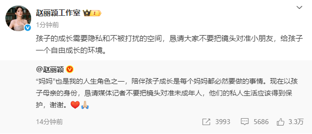 随后,赵丽颖工作室转发微博称:孩子的成长需要隐私和不被打扰的空间,恳请大家不要把镜头对准小朋友,给孩子一个自由成长的环境。