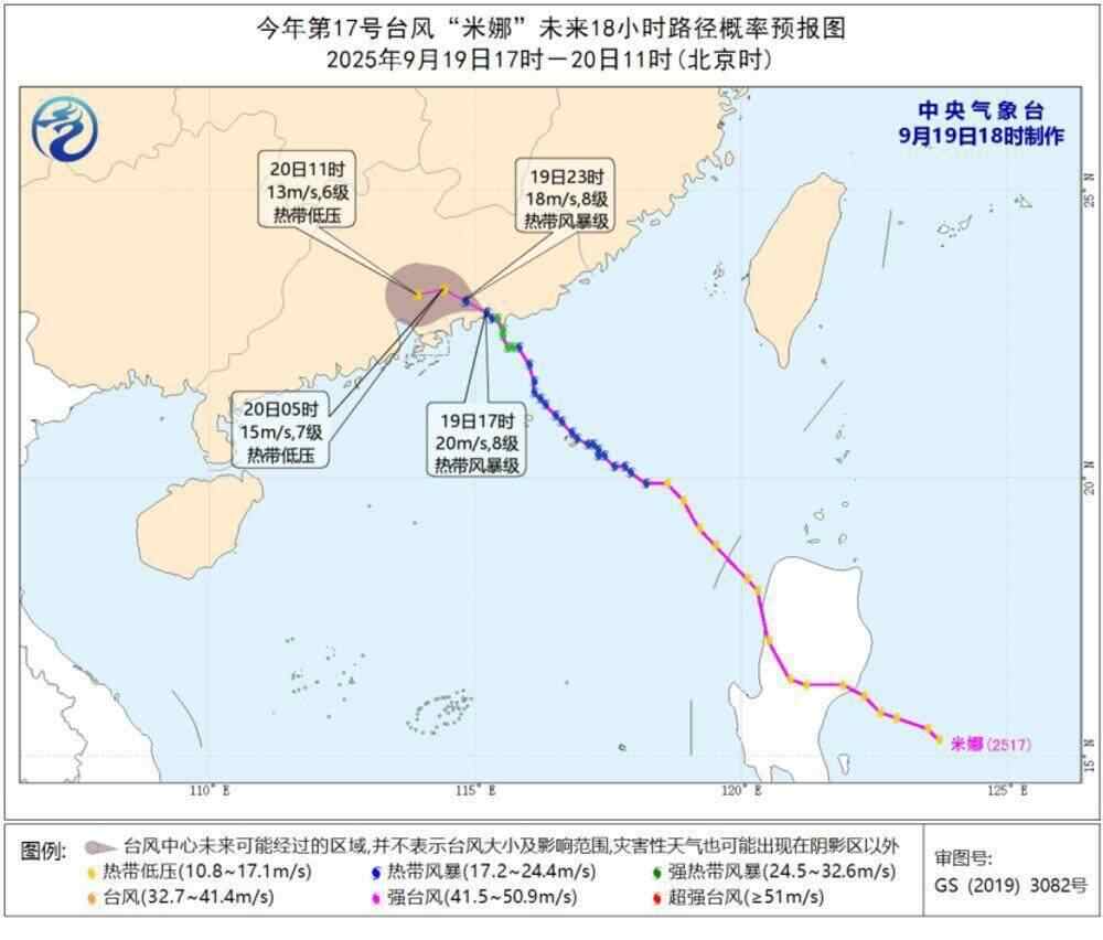 根据中央气象台观测,17号台风“米娜”的中心,19日14时50分前后,在广东省汕尾市沿海登陆,登陆时中心附近最大风力10级,达到强热带风暴强度。截至19日18时,“米娜”中心进一步移入广东省汕尾市海丰县境内。