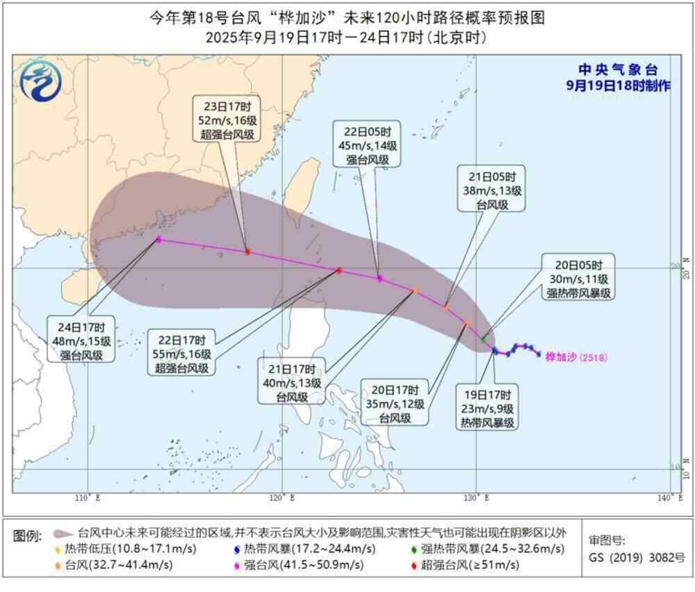 预计“桦加沙”将以每小时5-10公里的速度,向西北方向移动,强度逐渐加强。根据中央气象台9月19日18时发布的台风路径和强度预报图,“桦加沙”将在21日至22日,以超强台风强度自东向西穿越巴士海峡,并在24日以强台风强度靠近广东沿海地区。
