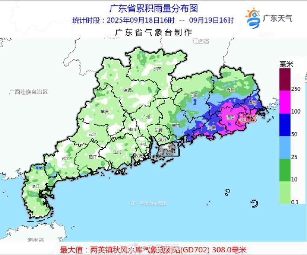 根据广东省气象部门观测和统计,9月18日16时到19日16时,受台风“米娜”影响,广东有8个镇街录得超过250毫米的特大暴雨,有196个镇街录得100毫米~250毫米的大暴雨;汕头潮南区两英镇累积雨量达308毫米,为全省雨量之最,其他雨量较大的镇街还包括揭阳普宁市池尾街道287.2毫米、潮州潮安区庵埠镇202.5毫米、梅州丰顺县八乡山镇195.5毫米、深圳深汕特别合作区鲘门镇180毫米。