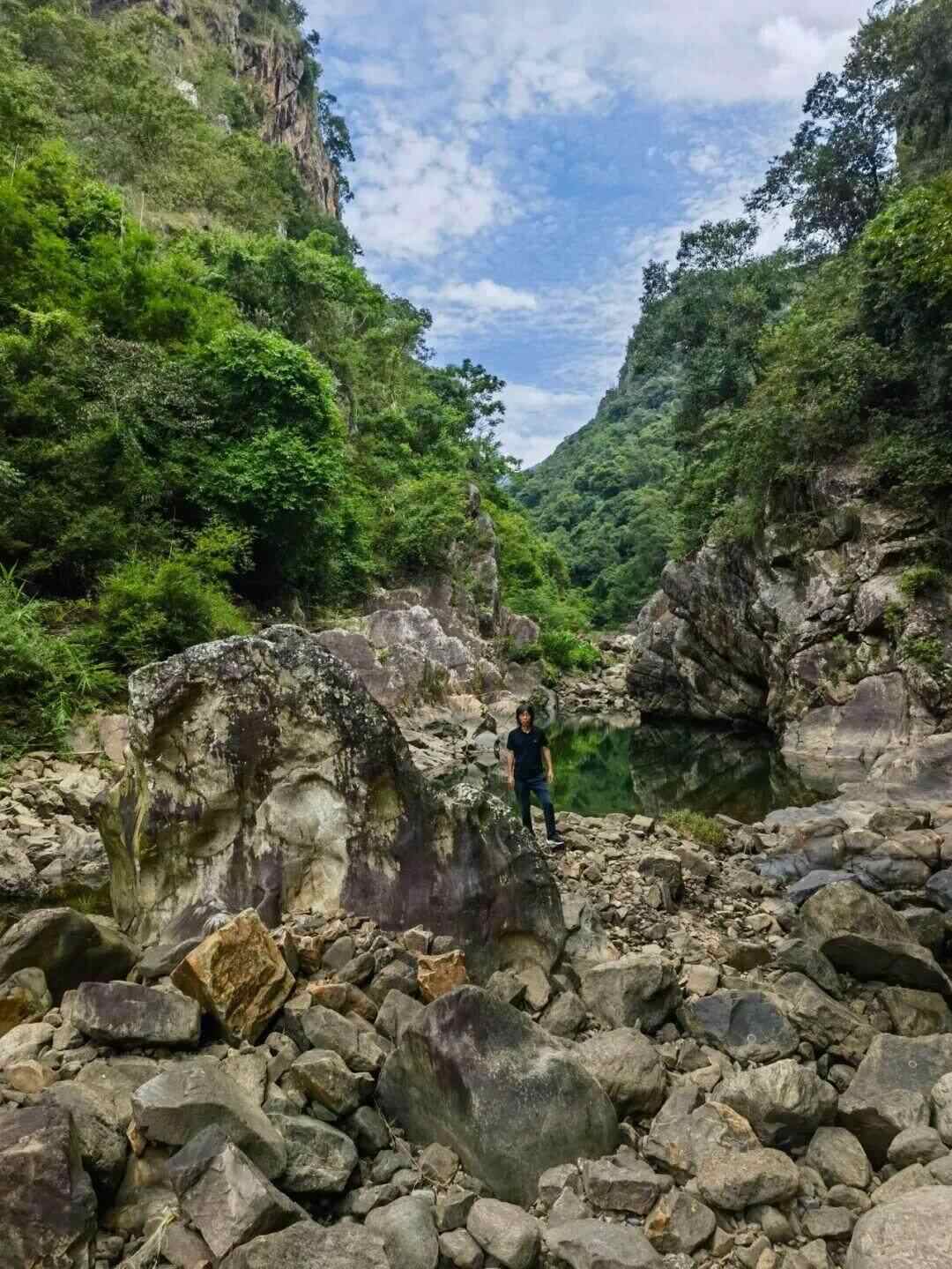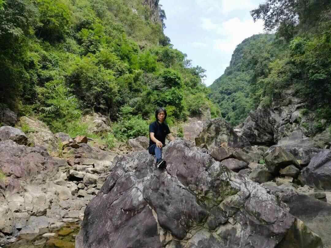 我则到谷底潭边。衡运刚刚头顶小船,运到深潭边。须藉船渡深潭,方得入谷底巨石薮。试了一下,我在前,他居后,我拿一长杉木板以为桨,往前划。未几,舣岸,跃上一石。从出发到停岸,认认真真演练了一遍,有了把握。眼前的巨石薮太壮观了,大石横陈乱堆,如狗,如猪,如龙,如鹰,如车,如旗,如风,如吼,如怒,如急……间有水域,俱清澈无比,鳞鱼幽游无定。跳着石头往前,突然,断崖上两条瀑布如烟泄下。菖蒲点缀,幽极。