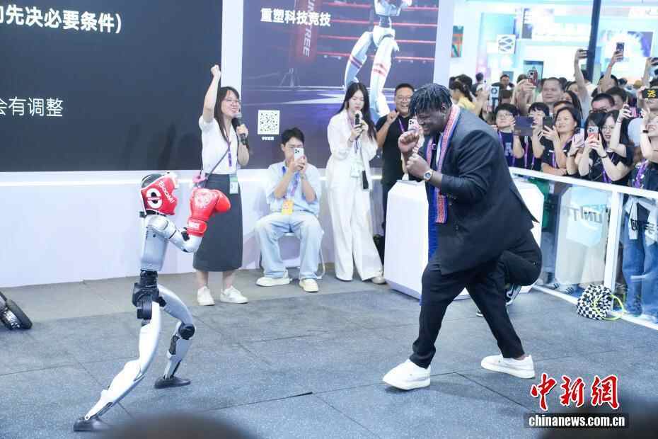 9月17日,正在广西南宁举行的第22届中国—东盟博览会现场,展出的不少先进科技产品成为场上的焦点。图为尼日利亚网络达人博密与宇树机器人进行“拳击比赛”吸引不少参观者。
