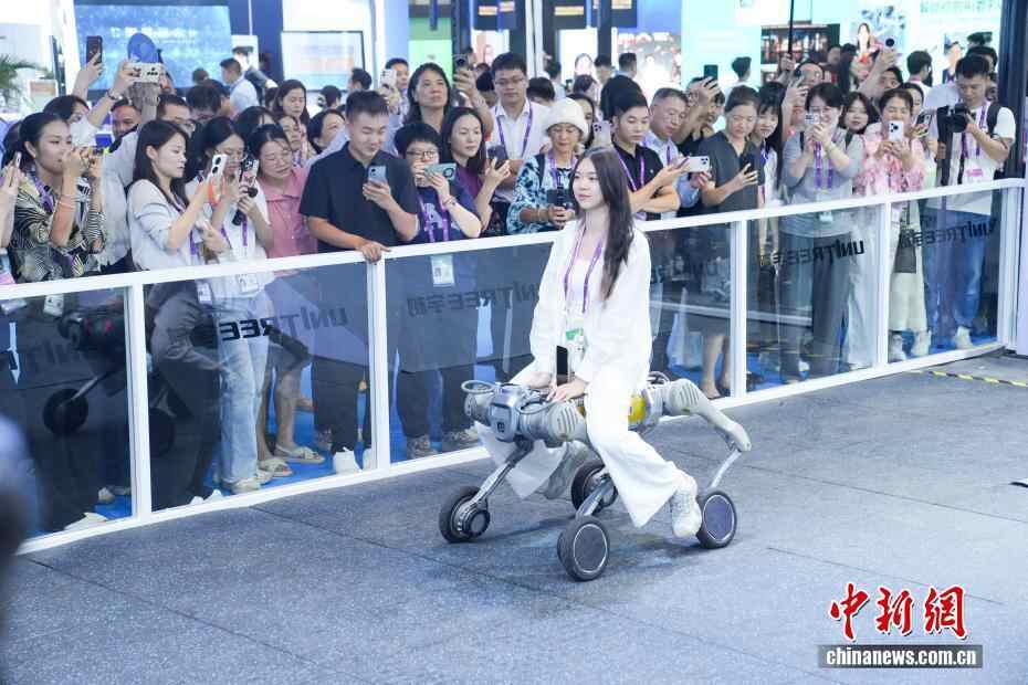 9月17日,正在广西南宁举行的第22届中国—东盟博览会现场,展出的不少先进科技产品成为焦点。图为工作人员乘坐一台机器狗巡游以展示其载重能力。