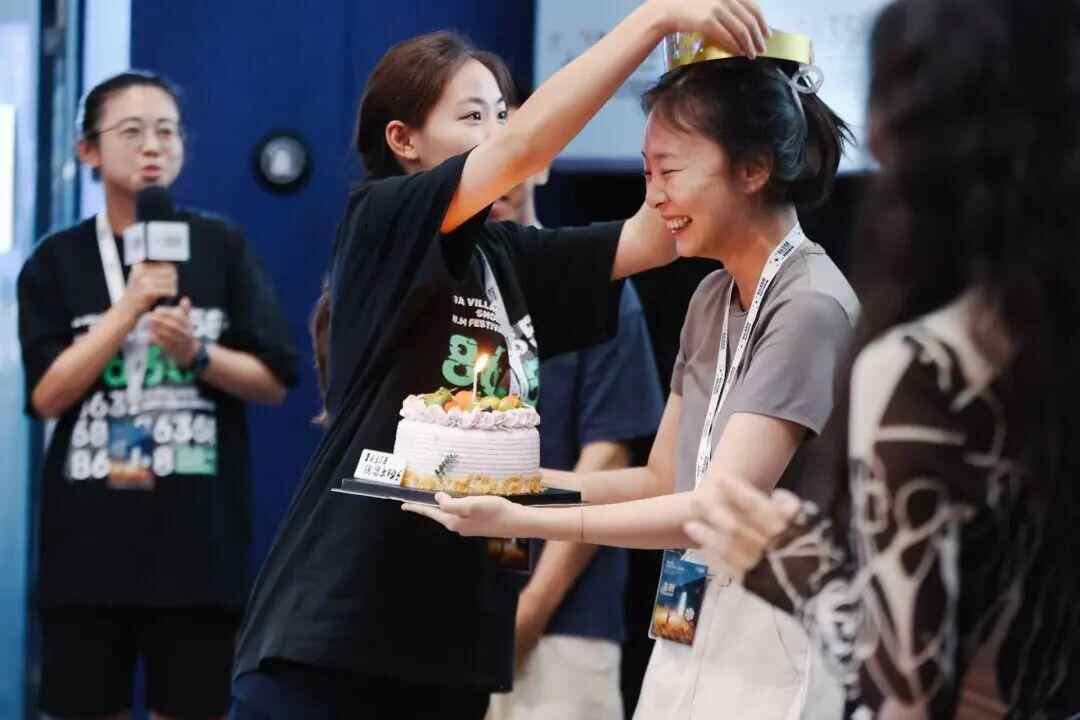 这份来自贾家庄的用心,让我特别感动。他们真的花了很多心思去了解每一位导演。我的短片首映日正好是我的生日,起初还以为只是巧合。直到电影放完,灯光亮起,工作人员和志愿者们一起捧着蛋糕上台,全场齐声为我唱生日歌的那一刻,我才恍然大悟——原来这一切都是他们精心安排的。