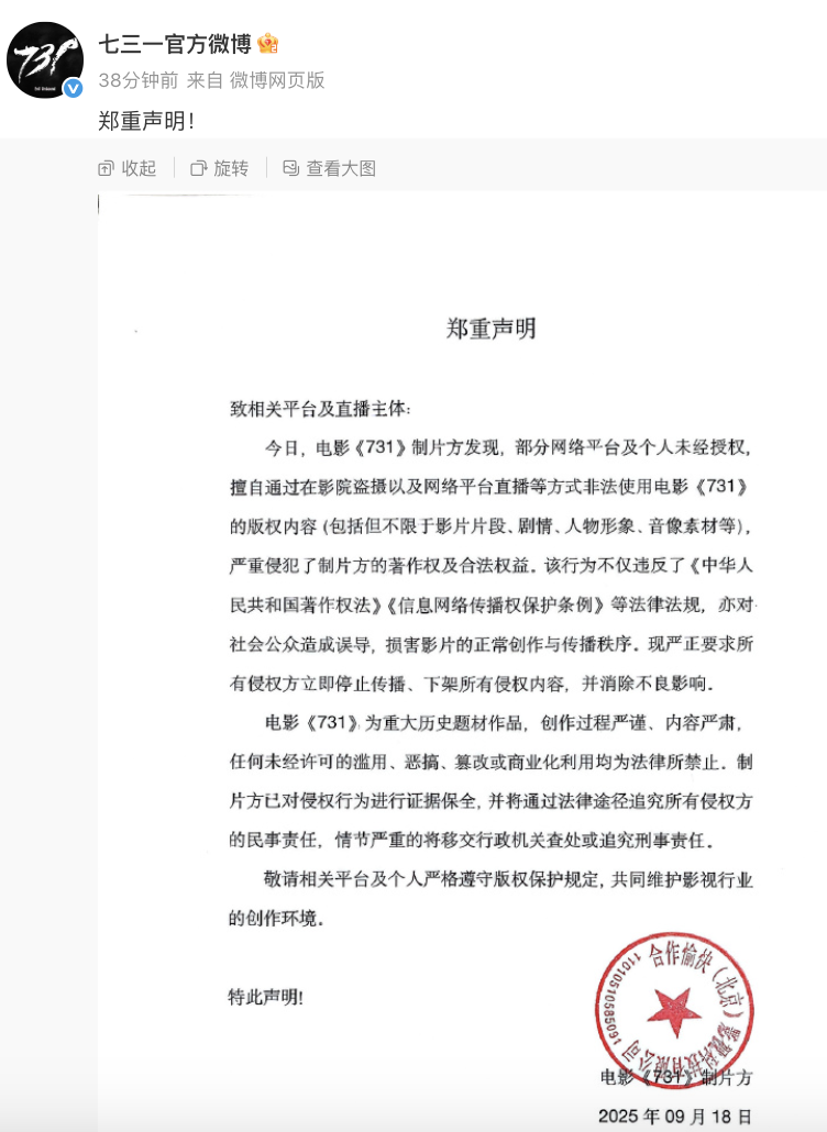 声明称,电影《731》制片方今日发现,部分网络平台及个人未经授权,擅自通过在影院盗摄以及网络平台直播等方式非法使用电影《731》的版权内容(包括但不限于影片片段、剧情、人物形象、音像素材等),严重侵犯了制片方的著作权及合法权益。