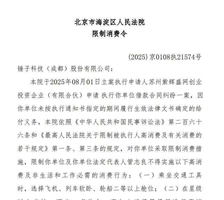 天眼查天眼风险信息显示,近日,锤子科技(成都)股份有限公司新增2条失信被执行人信息(老赖),均涉及与苏州紫辉盛网创业投资企业(有限合伙)相关借款合同纠纷案件,履行情况为全部未履行,执行法院为北京市海淀区人民法院。此前,该公司已因上述案件被执行2142万余元,并被限制高消费。