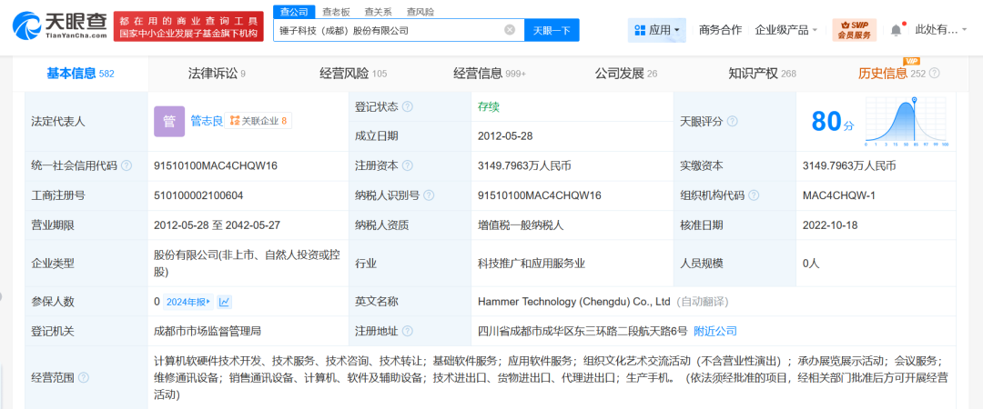 锤子科技(成都)股份有限公司成立于2012年5月,法定代表人为管志良,注册资本约3149.8万元人民币,经营范围含基础软件服务、应用软件服务、组织文化艺术交流活动、承办展览展示活动等。主要人员信息显示,罗永浩在该公司担任董事长并持股约23%。