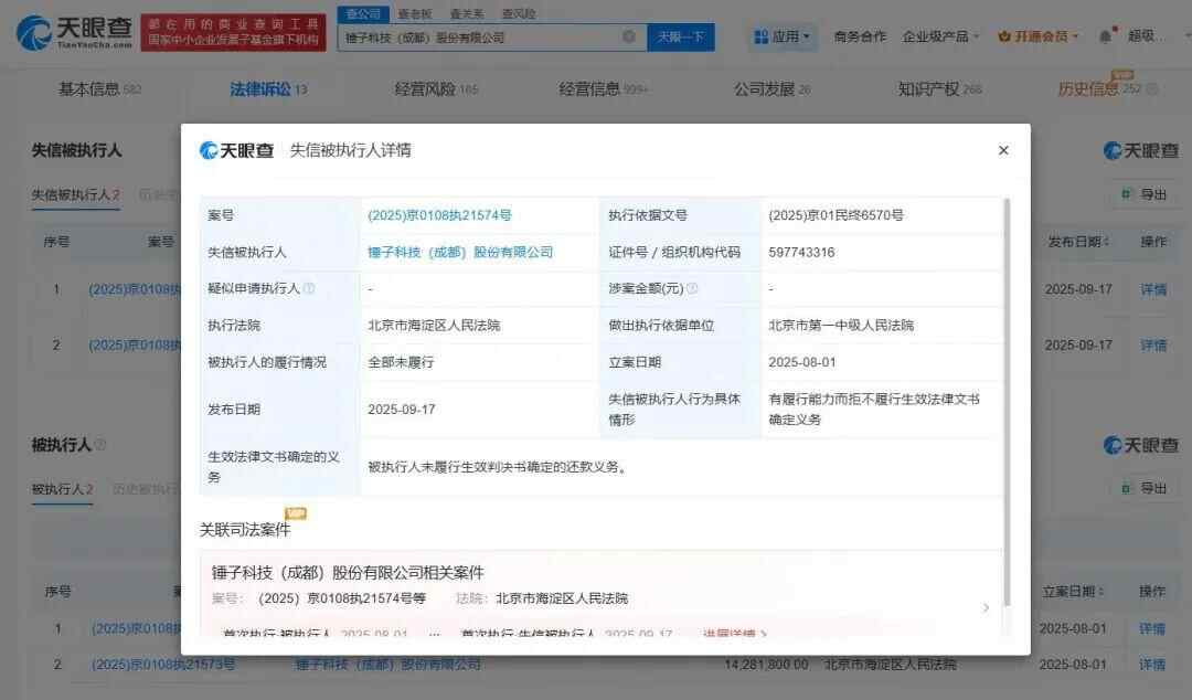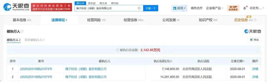 近日,锤子科技(成都)股份有限公司新增2条被执行人信息,执行标的合计2142万余元,执行法院为北京市海淀区人民法院。