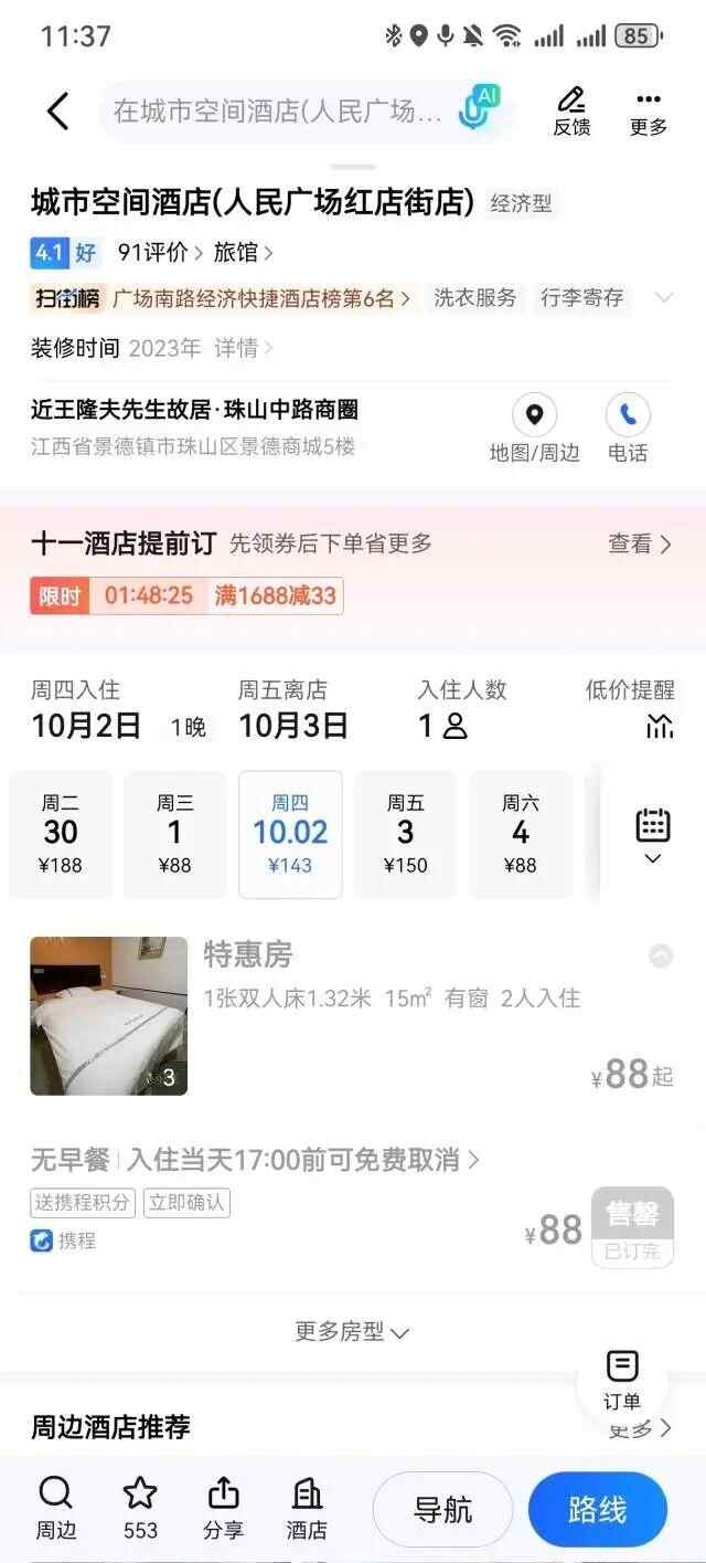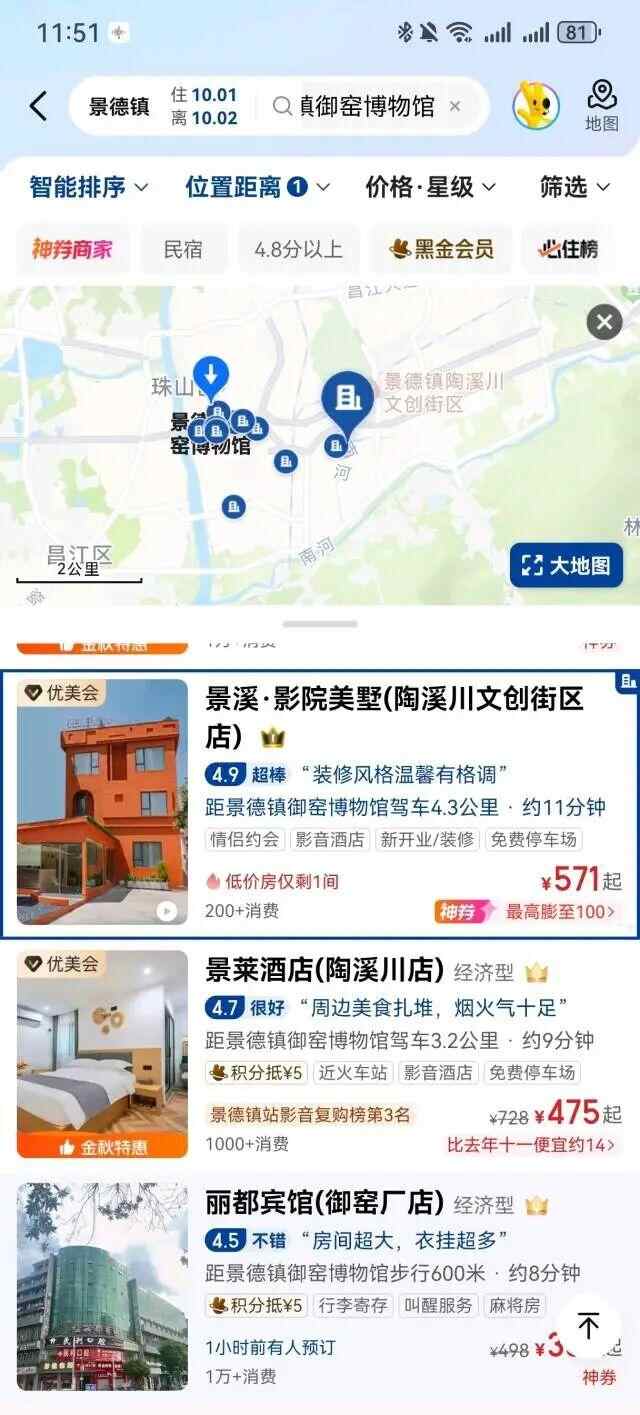 同时,记者查询景德镇御窑博物馆周边酒店发现,自“十一”起价格普遍有所提升,但仍有300—400元经济型房型。