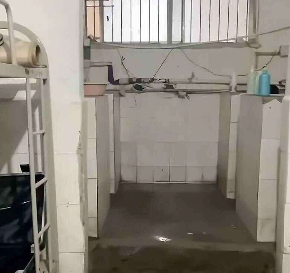 根据该网友描述,自己居住的宿舍是学校食堂下面的地下室,还是一个公共厕所改造而成,天热的时候气味难闻。其发布的视频显示,一扇绿色掉漆的木门被打开后,屋内看起来是一间宿舍,有男生正在整理东西,两侧放置了多个上下铺,加起来有20多张床位。屋内光线昏暗,水泥地面又潮又脏。视频最后拍到了宿舍最里面是四个半开放的蹲便,每个蹲便肮脏不堪,隔断墙上的瓷砖也脱落了不少。