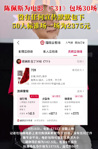 9月18日,电影《731》全国上映。记者从猫眼电影平台了解到,陈佩斯在无任何宣传的情况下,默默包下了30场《731》。