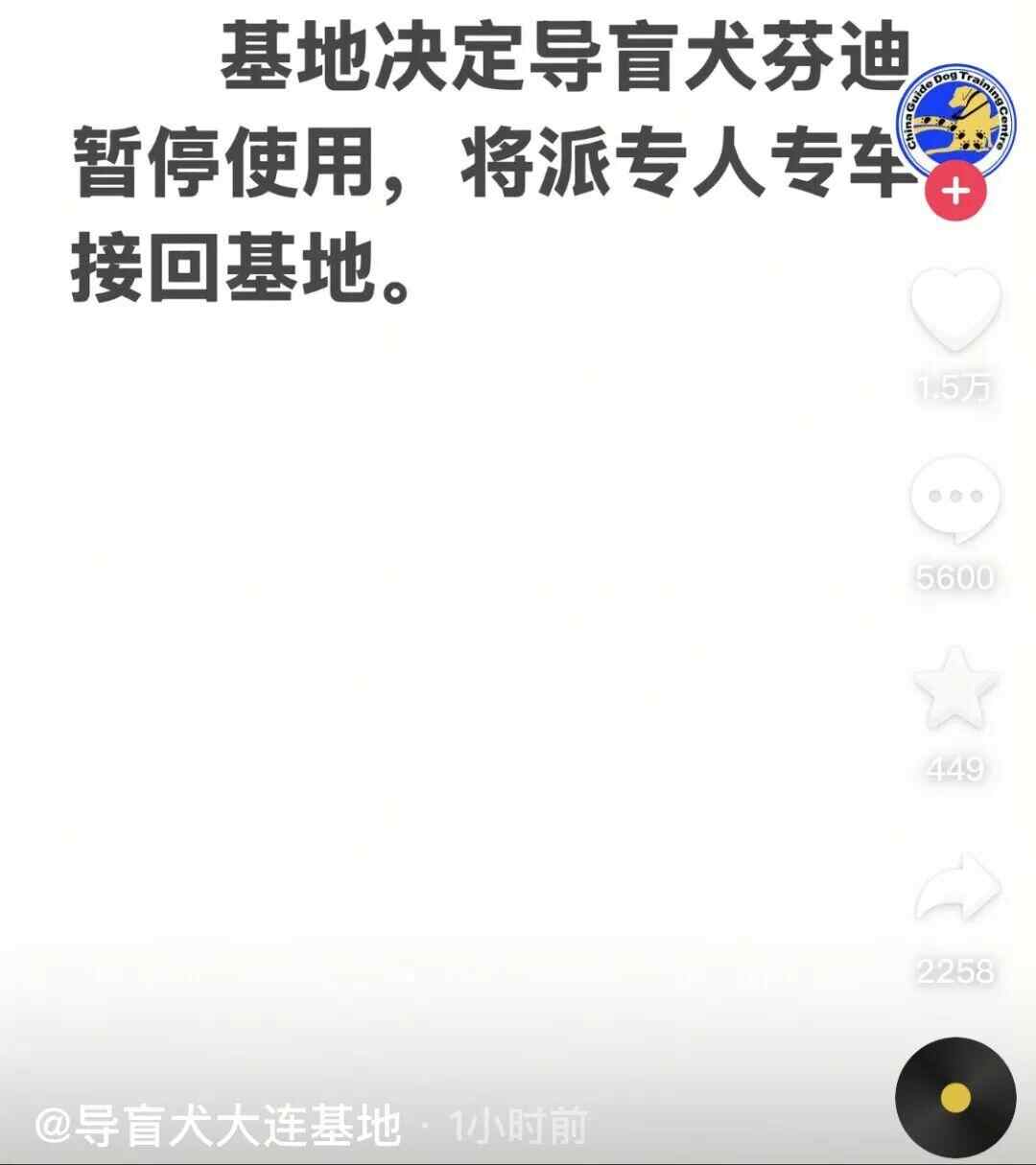 爬山的盲人夫妻的导盲犬是一只拉布拉多,名字叫芬迪,属于大连导盲犬基地。9月18日上午10点左右,“导盲犬大连基地”账号网上发文回应:基地决定导盲犬芬迪暂停使用,将派专人专车接回基地。大连市残疾人联合会表示已涉入此事,并证实基地已派专车收回犬只。