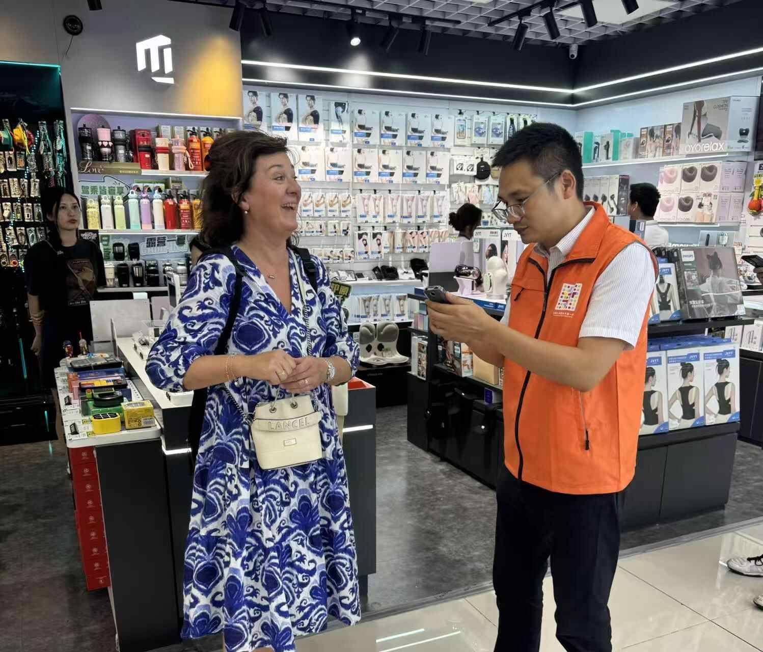 此外,一支身着“橙马甲”的志愿队伍活跃在街头巷尾,他们手持AI翻译机,有效打破与外籍人士的语言交流障碍。街道积极动员市场商户、沿街商户及员工加入“涉外服务志愿队”,首批已招募超过100人。各大专业市场和购物中心根据外商客流情况,正逐步配备双语服务人员,为国际客商提供咨询、导购、指引等周到服务。