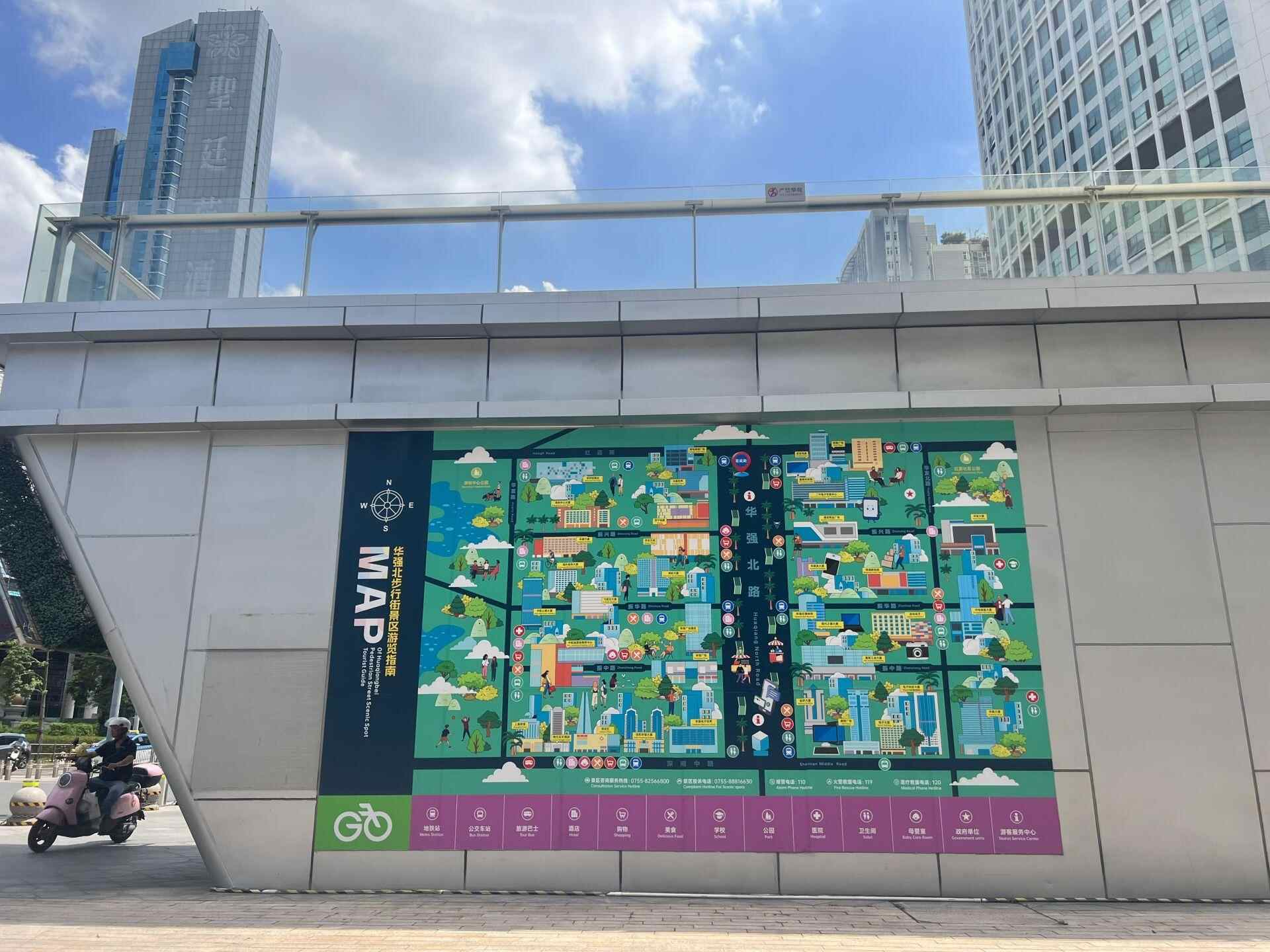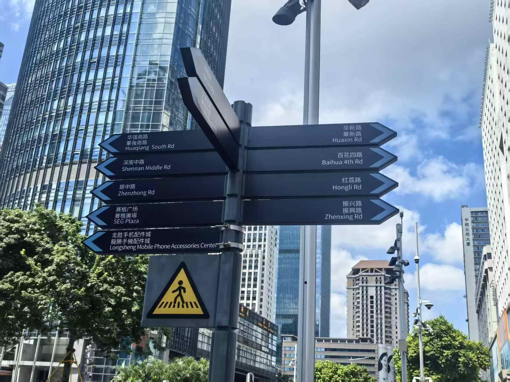 华强北步行街的标识标牌已全面焕新,关键节点实现多语种覆盖。每个地铁口都设有巨幅双语地图,街区道路的每根电线杆均配备清晰的方向指引,辖区内所有商用电子屏也加速推进“双语化”改造,确保语言识别“无障碍”。同时,辖区内35个专业市场在服务台等显眼位置设置至少一处共享翻译设备租赁点,为国际客商提供便捷服务。