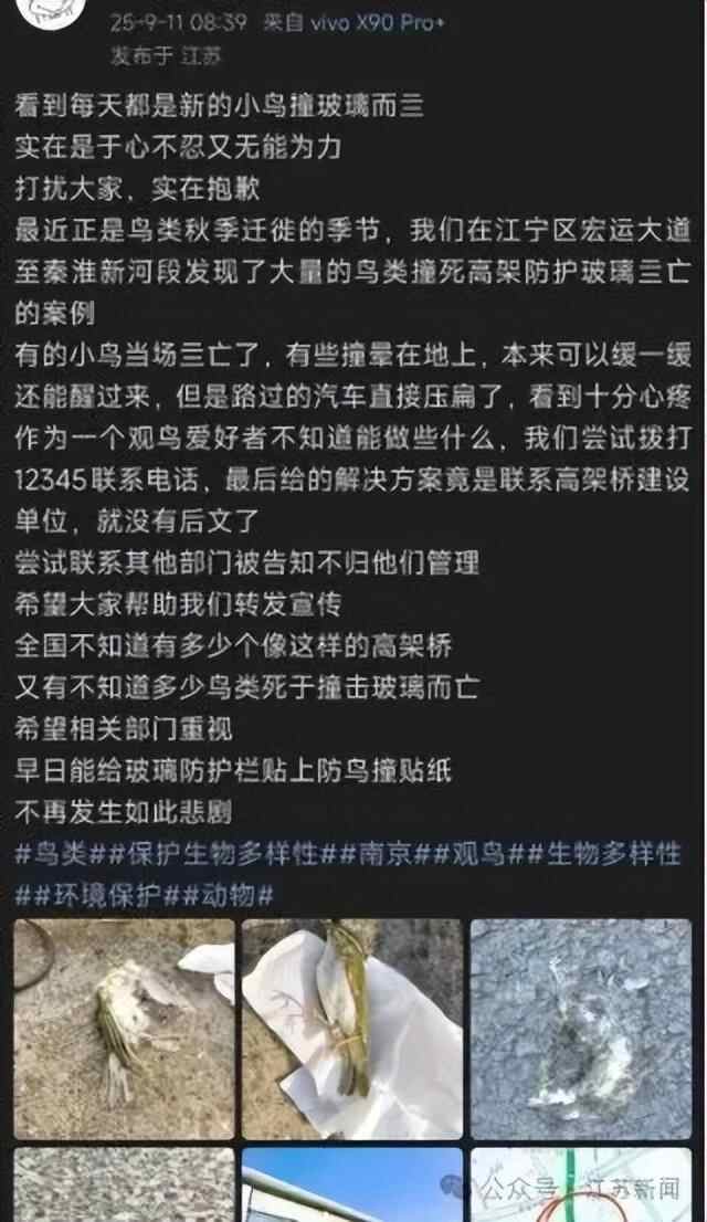 眼下正值秋季候鸟迁徙季,南京网友牛先生爆料,南京江宁区宏运大道至秦淮新河段的高架路段,成了“小鸟交通事故高发地”,大量鸟类撞击高架防护玻璃死亡,有些小鸟当场殒命,有些撞晕后又遭路过车辆碾压,场面令人揪心。