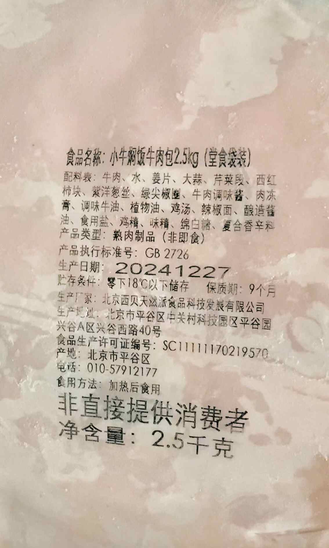 “关键证据”为两张图片。图中分别为“小牛焖饭牛肉包2.5kg(堂食袋装)”“椒麻鸡350g(堂食袋装)”。从图片上看,其与超市购买的预包装食品基本无异。生产厂家为北京西贝天然派食品科技发展有限公司。标签上还注明配料表、食品生产许可证号、保质期、贮存条件等。包装上“堂食袋装”“非直接提供消费者”两个关键词格外醒目。