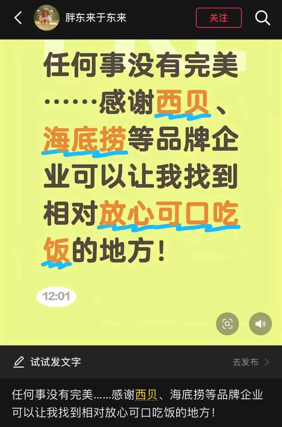 9月12日,胖东来老板于东来发文力挺西贝:任何事没有完美,感谢西贝、海底捞等品牌企业可以让我找到相对放心可口吃饭的地方!