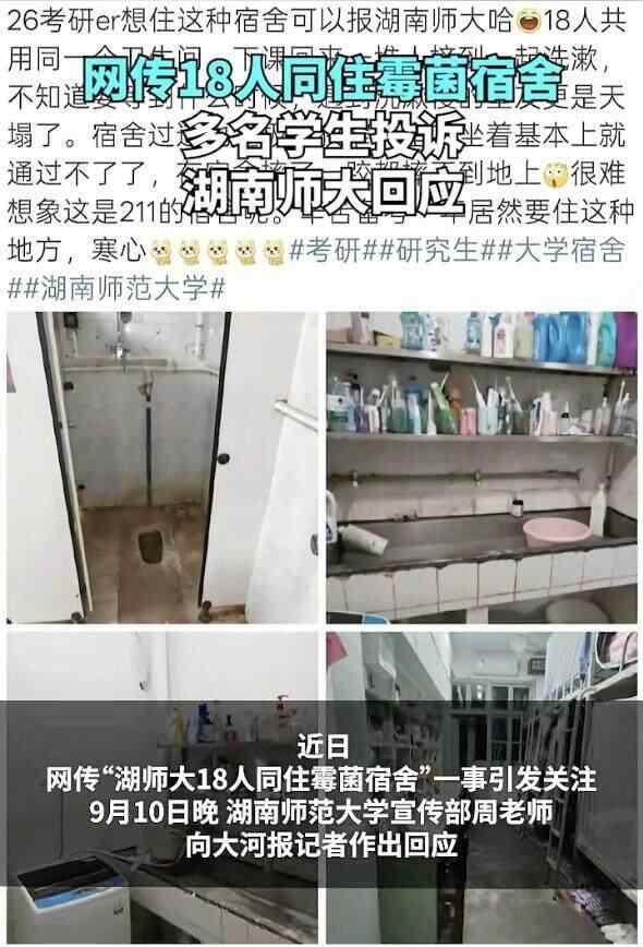 此前报道中提到,湖南师范大学相关老师表示,因学校扩招,今年的宿舍情况确实很紧张,但网传的18人间宿舍其实是6人一间,也没有网上说的“霉菌宿舍”那么夸张。目前老生已经开学,大一和研一的新生将于9月13日、14日报到,15日正式上课。