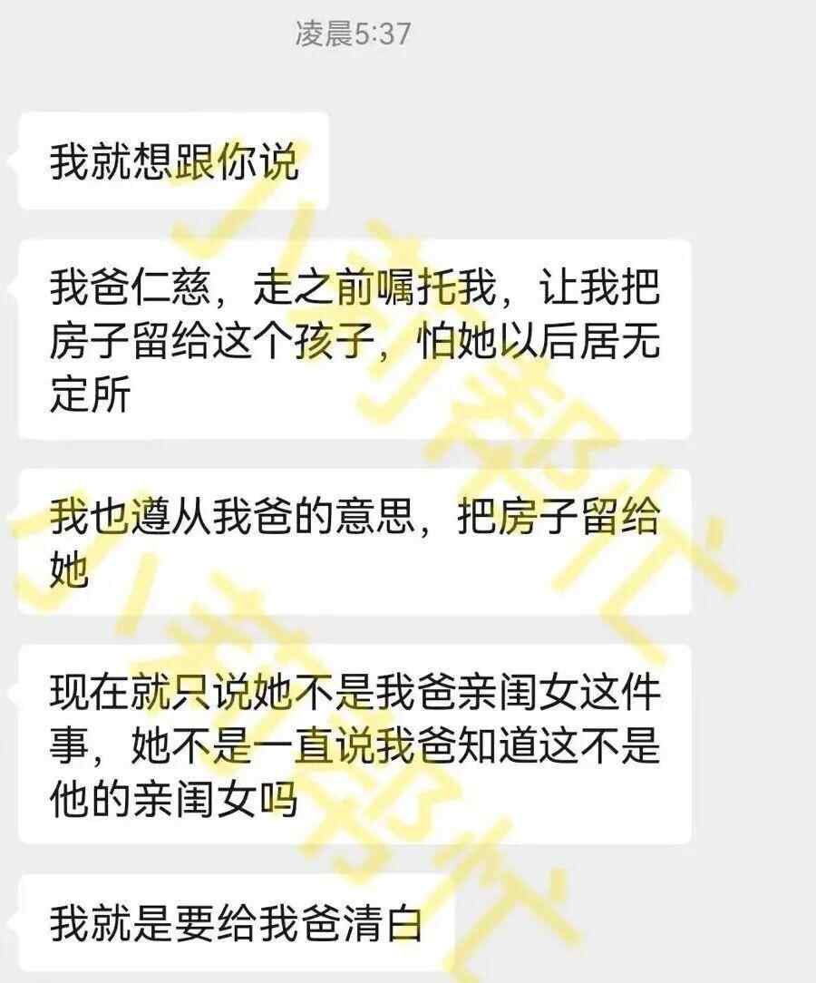 9月11日,李先生的亲生女儿发消息告诉小莉,父亲早几天已经去世,遗愿是怕孩子居无定所,把房子留给非亲生的女儿,同时希望能还自己一个清白(对于养了10年的女儿非亲生一事此前并不知情)。