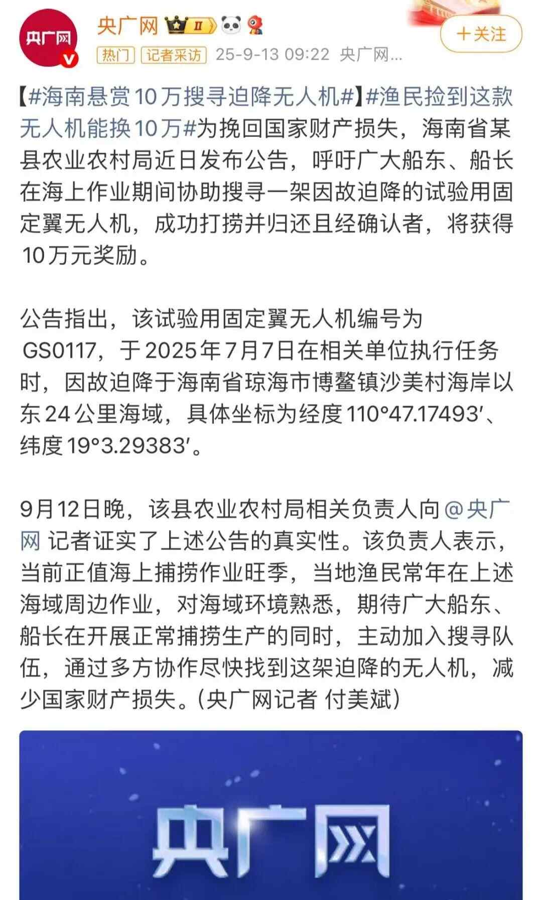 公告称,2025年7月7日相关单位在执行任务时,试验用固定翼无人机(编号:GS0117)因故迫降于海南省琼海市博鳌镇沙美村海岸以东24公里海域(坐标:经度110°47.17493',纬度19°3.29383')。为避免国家财产遭受损失,现呼吁广大船东船长加入搜寻队伍,搜寻实验无人机。同时该相关单位计划给予打捞归还无人机(经确认为该单位搜寻的无人机)的渔民10万元奖励,望广大船东船长在进行捕捞作业的同时积极参与搜寻工作。