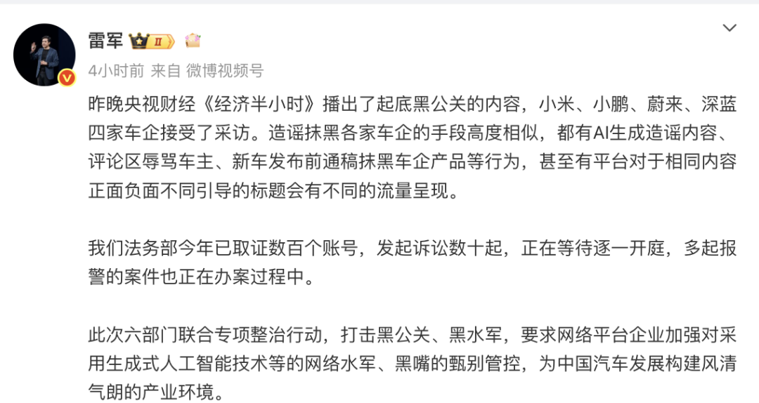 雷军说, 此次六部门联合专项整治行动,打击黑公关、黑水军,要求网络平台企业加强对采用生成式人工智能技术等的网络水军、黑嘴的甄别管控,为中国汽车发展构建风清气朗的产业环境。