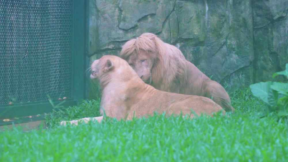 而现实中,阿杭也是个“宠妻狂魔”。它常与爱妻“贝贝”并肩晒太阳,互相梳毛、贴贴额头,偶尔发出低吼警惕四周,展现雄狮的担当与温柔。