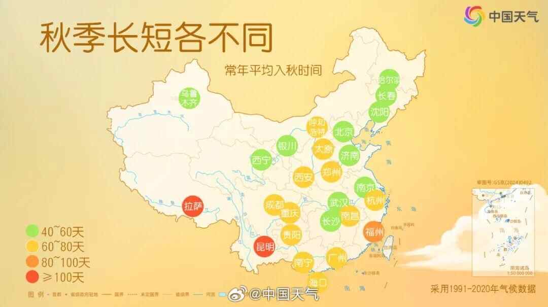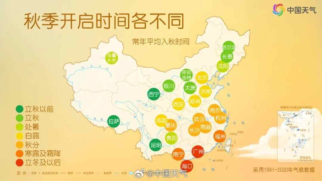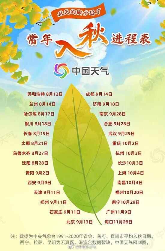 中国天气网统计了1991至2020年省会级城市的入秋日期发现,9月至10月是全国入秋最集中的时间,北京、上海、成都、长沙、武汉、杭州等18个省会级城市会陆续开启入秋进程。而广州,毫无意外地成为了全国最晚入秋的省会城市之一,仅次于海口。