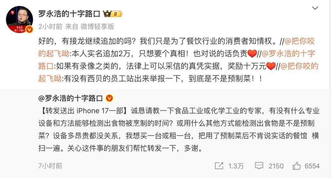 同时,他还发布10万元悬赏,公开征集西贝使用预制菜的“真凭实据”。