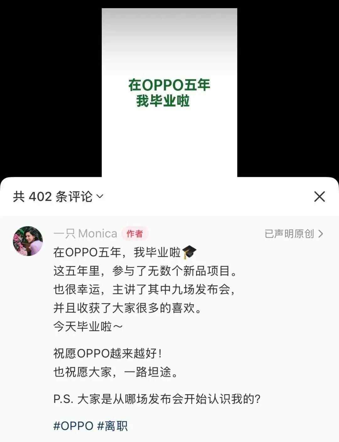近日,OPPO产品经理Monica在社交平台正式宣布从OPPO离职,其账号简介已更新为“前OPPO打工人”。