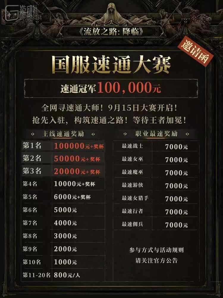 《流放之路:降临》将在抖音平台同步开启“国服速通大赛”,面向全网征集速通高手。9月15日至9月28日活动期间,主线速通榜前二十名可获得丰厚奖励,七大职业的最速通关者还将获得额外奖励。