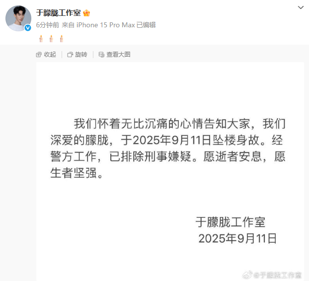 9月11日,于朦胧工作室发文:我们怀着无比沉痛的心情告知大家,我们深爱的朦胧,于2025年9月11日坠楼身故。经警方工作,已排除刑事嫌疑。愿逝者安息,愿生者坚强。