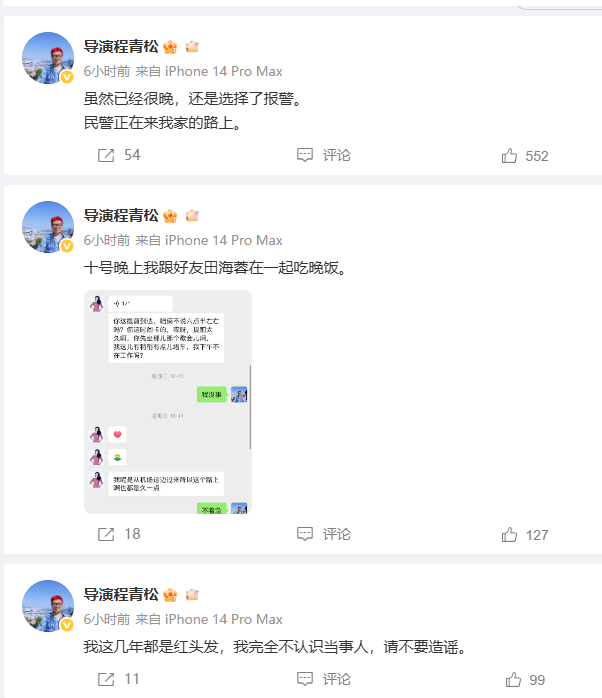 有网友根据现场出警照片,推测于朦胧聚餐的朋友中有导演程青松。对此,程青松于9月12日凌晨通过微博多次发文澄清,称自己10号晚上与好友一起用餐,并强调“我这几年都是红头发,完全不认识当事人,请不要造谣。”目前,程青松就此事已报警。