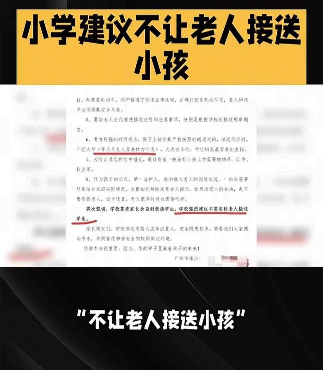 据家长反馈,该校在沟通中提及,老年人若身体状况欠佳,接送途中可能因体力不支、应对突发状况能力有限等引发安全风险,因此建议家长优先考虑自身或身体条件良好的人员承担接送任务。建议发布后,迅速引发不同观点碰撞。