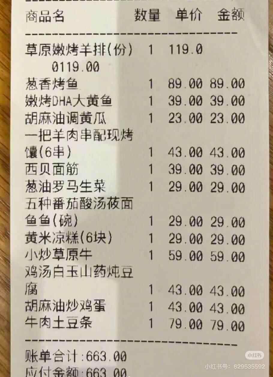 他还曝光了罗永浩当天点餐的小票,根据小票,罗永浩一行人15人一共点了13个餐,账单合计663元,其中草原嫩烤羊排价格最贵,达119元一份,烤鱼、牛肉土豆条都在七八十元。