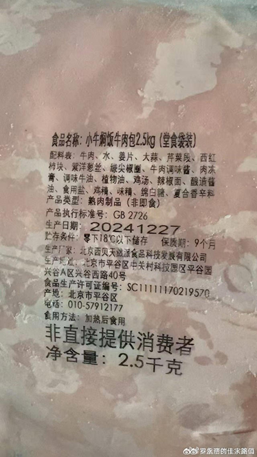 西贝是否使用预制菜?有网友在罗永浩微博下留言,贴出一张生产厂家为“北京西贝天然派食品科技发展有限公司”的小牛焖饭牛肉包,就是怀疑西贝使用的预制菜包。此外,也有消费者指出,西贝上菜速度非常快,而且不能调整口味“少油少盐”,怀疑是因为使用预制菜包无法支持调整口味和做法。
