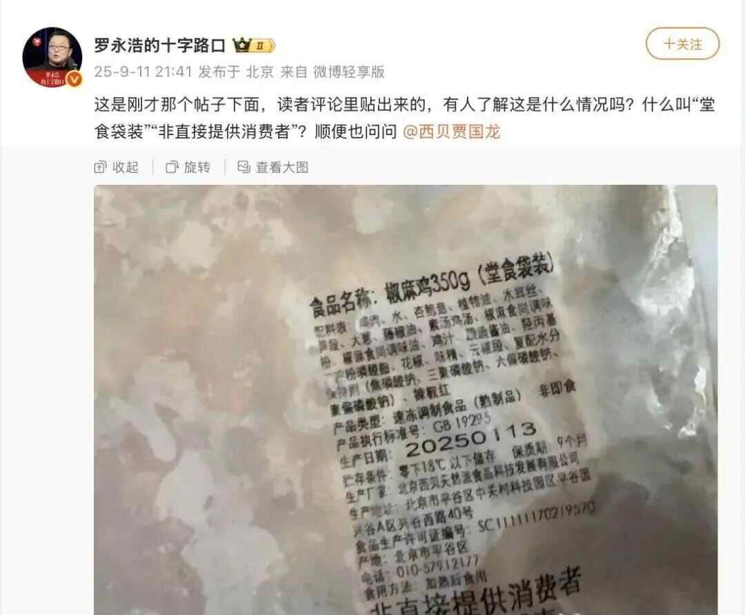“什么叫‘堂食袋装’‘非直接提供消费者’?顺便也问问@西贝贾国龙。”9月11日晚,网络名人罗永浩再度晒出两袋由西贝旗下企业生产的食品,外包装显示分别为“小牛焖饭牛肉包2.5kg”“椒麻鸡350g”,喊话西贝回应预制菜争议。12日上午,记者向西贝方面咨询这两袋食品是否为预制菜,供应给哪些渠道,截至发稿,暂未获回复。