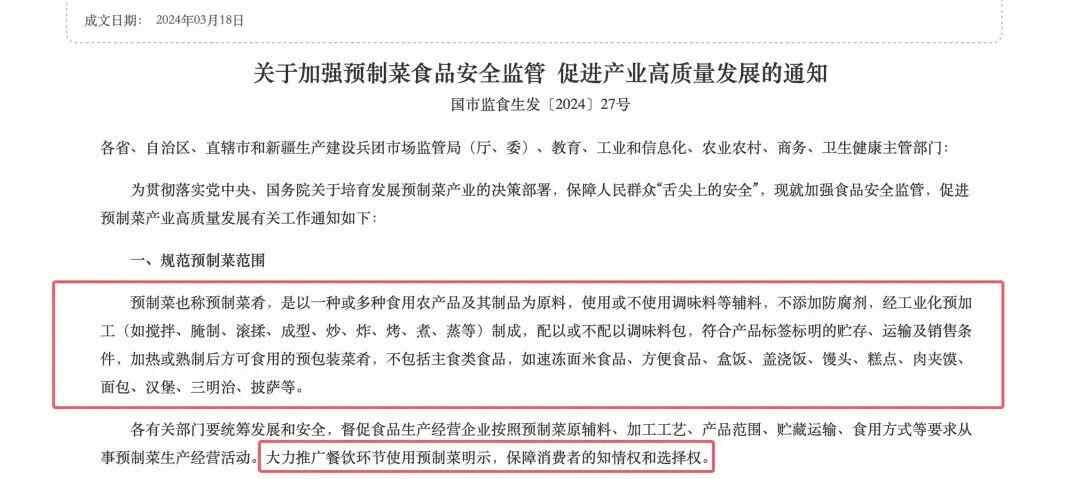 关于预制菜,有关部门在去年便下发通知,明确预制菜范围,对预制菜原辅料、预加工工艺等进行界定,并明确了预制菜食品安全监管、使用预制菜明示等内容。
