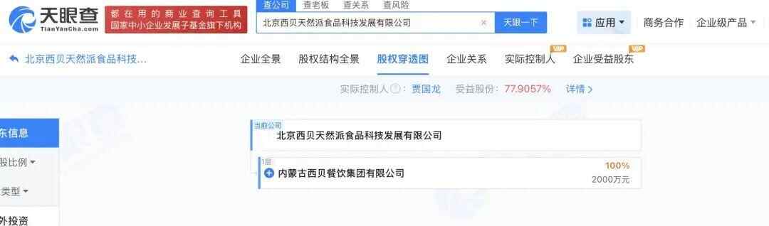 上述两袋食品的生产企业名为北京西贝天然派食品科技发展有限公司。天眼查显示,该企业成立日期为2017年8月18日,注册地为北京市平谷区农业中关村现代食品营养谷,由内蒙古西贝餐饮集团有限公司持股100%。
